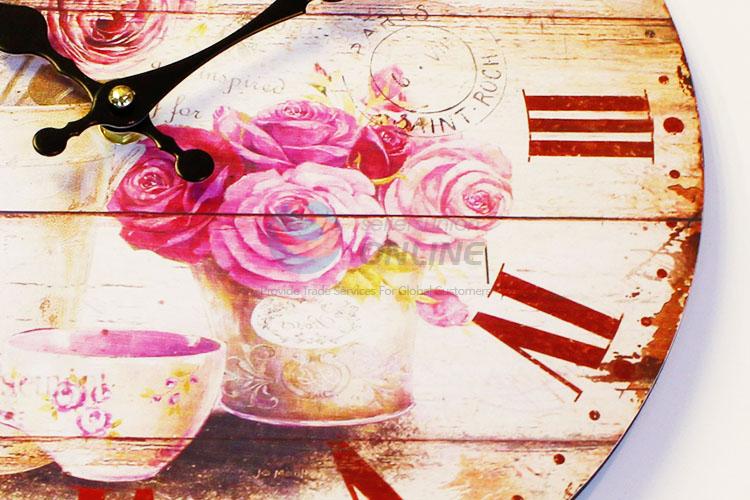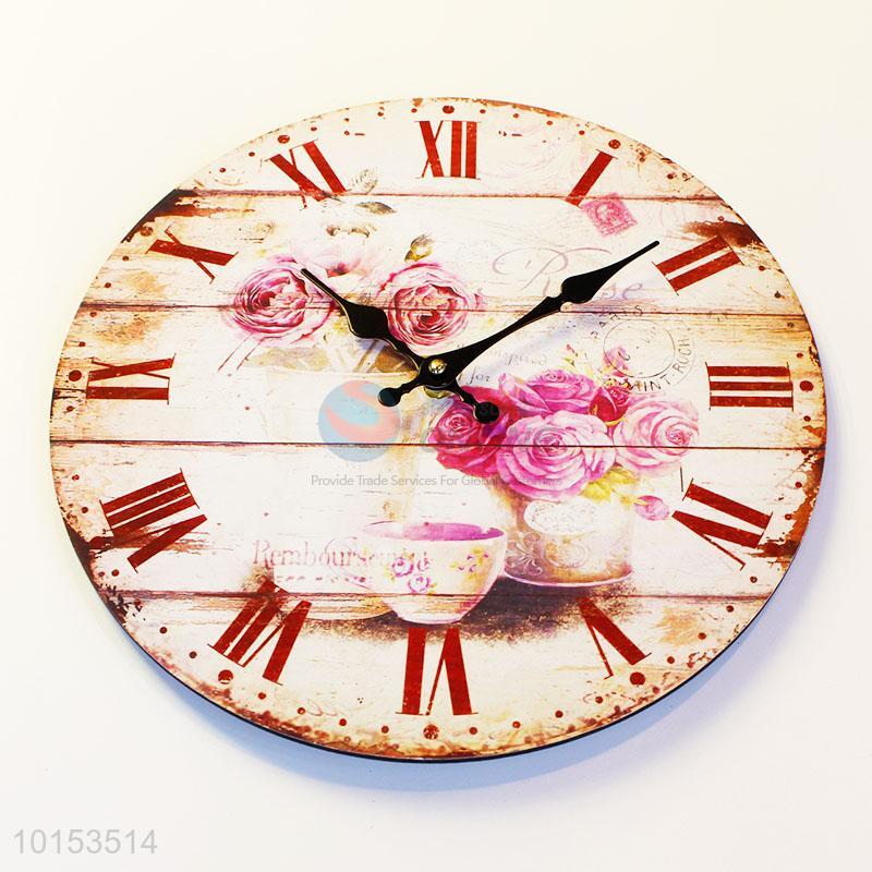Round Shaped Rose Pattern Wall Clock Roman Number Board Clock for Living Room Decoration