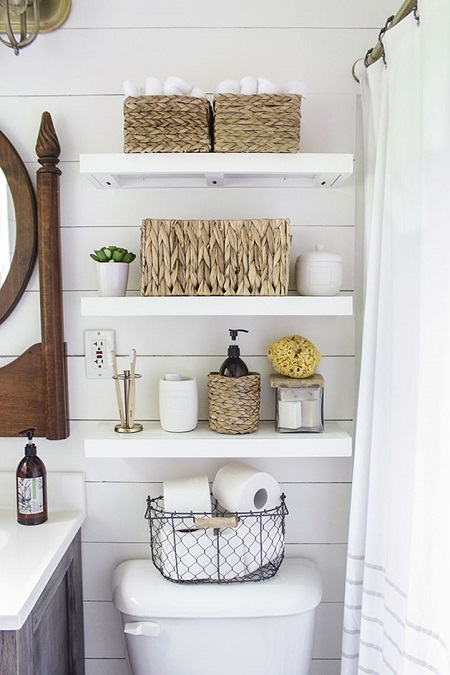 No space? No problem. Three stacked floating shelves are all you need to add extra room for towels, soap, and even decor accessories. Store extra toilet paper in a wire basket on top of your toilet.