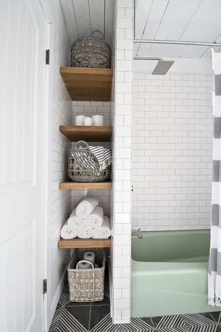 If you're renovating your bathroom, leave room for a super narrow alcove. Install shelves, then use them to stack extra towels and hold baskets with beauty supplies.