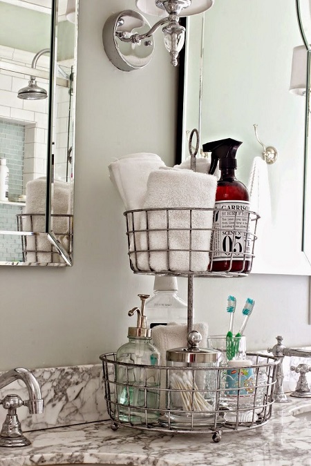 Use a tiered basket to create two different bathroom cubbies: One for towels and soap, and the other for products used during nighttime rituals.